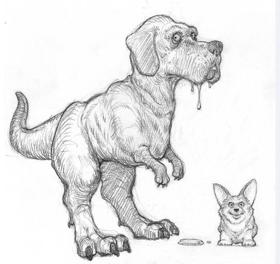 A humorous drawing of our Great Dane, Charlie and our Pembroke Corgi, Bella.